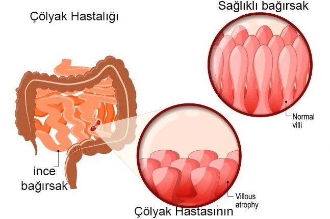 Çölyak hastalığı olan kişiler gluten (buğday, çavdar ve arpada bulunan bir protein) yediğinde, vücutları ince bağırsağa saldıran bir bağışıklık tepkisi oluşturur. Bu saldırılar, ince bağırsağı kaplayan ve besin emilimini sağlayan küçük parmaksı çıkıntılar olan villuslarda hasara yol açar. Villuslar hasar gördüğünde, besinler vücuda düzgün bir şekilde emilemez.
